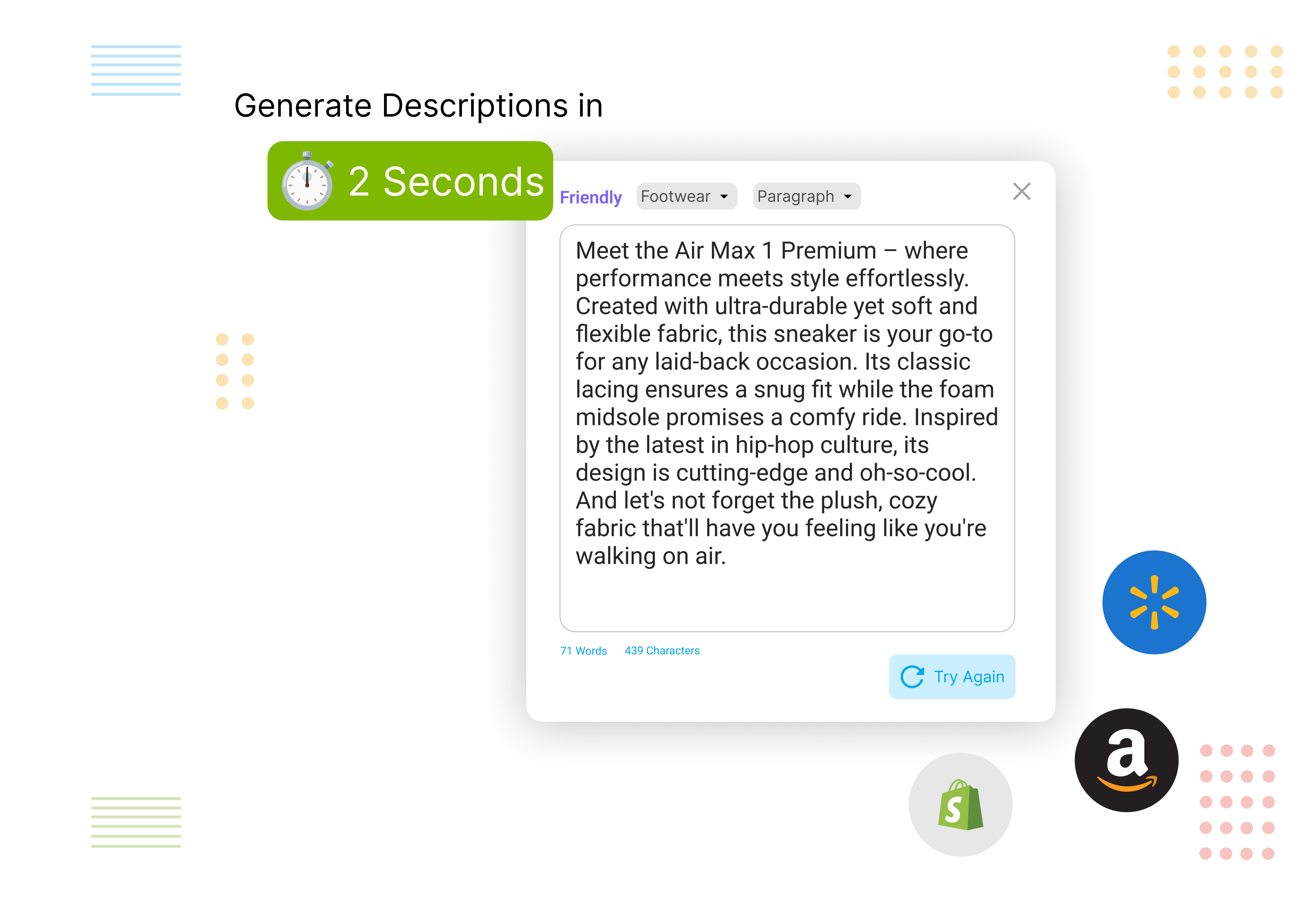 Effortlessly craft compelling product descriptions that resonate with customers and drive sales. Tailored for eCommerce marketing teams, our intuitive templates and integrations empower you to shed the burden of manual creation
